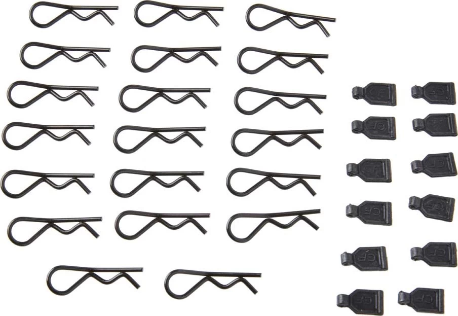 This is a package of 20 Duratrax 1/8 scale Body Clips with Pull Tabs. FEATURES: Steel construction, black in color Sized to fit body posts and bodies of 1/8 scale vehicles Curved at end for easy gripping Rubber pull tabs INCLUDES: Twenty 1/8 scale Body Clips and Pull Tabs SPECS: Length: 1.2" (30.5mm) jxs 03/21/16 ir/jxs