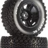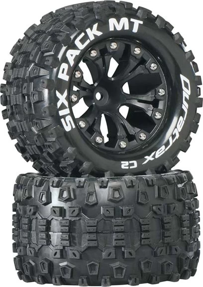 This is a pair of Duratrax Sixpack MT C2 Tires and Wheels. See the comments section below to find out what vehicles these tires and wheels fit. FEATURES: C2 (soft) compound is comparible to Pro-Line M3 and AKA soft ratings Ideal for loose to hard packed conditions Color-coded sidewall marking make it easy to identify each tread pattern at a glance One piece foam inserts INCLUDES: Two each, Sixpack MT C2 Tires, Foam Inserts and Black Wheels _ SPECS: Wheels: 2.8" Hex Size: 12mm COMMENTS: Fits the FRONT of the EP Stampede 2WD, EP Rustler 2WD, EP Monster Jam 2WD, EP Stampede 4WD and HPI Savage XS Flux. Fit the REAR of the GP Jato 2WD, GP Stampede 2WD, GP Rustler 2WD, EP Stampede 4WD and HPI Savage XS Flux. Also available in chrome by ordering DTXC3523. ajw 9-10-13 UPGX10/17/13