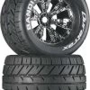 This is a pair of Duratrax Bandito ST 2.8" C2 Tires and Wheels for the rear of the 2WD Traxxas Stampede, Rustler, and Monster Jam. FEATURES: C2 (soft) compound is comparible to Pro-Line M3 and AKA soft ratings Designed for asphalt, concrete, hard and smooth surfaces Ideal for high traction condtions White sidewall markings One piece foam inserts INCLUDES: Two each, Bandito ST 2.8" C2 Tires, Foam Inserts and Chrome Wheels SPECS: Wheel Diamter: 2.8" (71mm) Width: 1.9" (49mm) Hex Size: 12mm COMMENTS: Also available with Black Wheels by ordering DTXC3542. jxs 09/26/13 ir/jxs