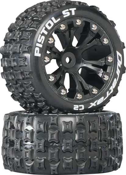 This is a pair of Duratrax Pistol ST C2 Tires and Wheels for the rear of the Traxxas 1/10 scale EP 2WD Stampede 2WD EP Monster Jam, and 2WD EP Rustler. FEATURES: C2 (soft) compound is comparable to Pro-Line M3 and AKA soft ratings Rectangular shaped tread One piece foam inserts INCLUDES: Two each, Pistol ST C2 Tires, Foam Inserts and Black Wheels _ SPECS: Wheel Diameter: 2.8" (71mm) Width: 1.9" (49mm) Hex Size: 12mm jxs 10/18/13 ir/jxs