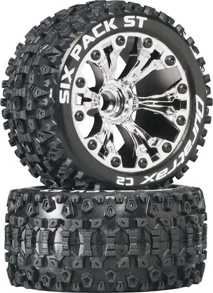 This is a pair of Duratrax Sixpack MT C2 Tires and Wheels for the Front of the Traxxas 1/10 scale 2WD GP Jato 3.3, Stampede, and Rustler. FEATURES: C2 (soft) compound is comparible to Pro-Line M3 and AKA soft ratings Ideal for loose to hard packed conditons Color-coded sidewall marking make it easy to identify each tread pattern at a glance One piece foam inserts INCLUDES: Two each, Sixpack MT C2 Tires, Foam Inserts and Chrome Wheels _ SPECS: Wheel Diamter: 2.8" (71mm) Width: 1.9" (49mm) Offset: 0.5" (12mm) Hex Size: 12mm CCOMMENTS: Also available with Black Wheels by ordering DTXC3558 jxs 09/25/13 ir/jxs
