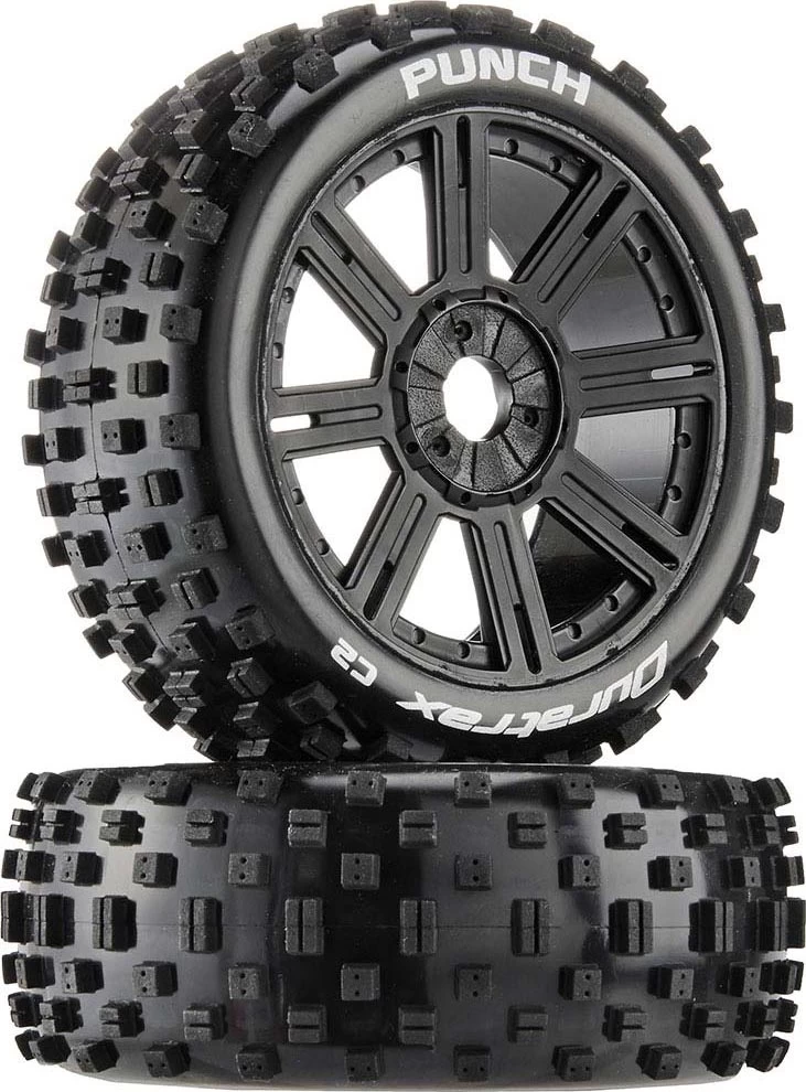 This is a pair of 1/8 scale Punch Buggy Tires and Eight Spoke Buggy Wheels in Matte Black from Duratrax. FEATURES: Widely spaced square tread with rectangular tread molded lengthwise in center Premounted to eight spoke wheels molded from composite plastic with matte black finish Tires molded from worldwide race-winning long lasting C2 compound Sidewall markings with tire type and firmness compound for easy identification at a glance Resealable packaging INCLUDES: Two 1/8 scale Punch Buggy Tires with Foam Inserts, DTXC3736 Two Black Spoke Wheels, DTXC3814 SPECS: Outer Diameter: 4.25" (108mm) Width: 1.6" (41.5mm) Hex Size: 17mm jxs 08/02/17 ir/jxs