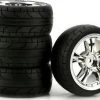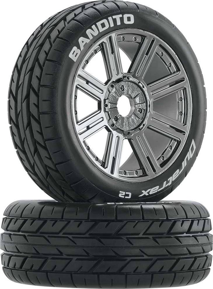 This is a pair of Duratrax Bandito 1/8 scale C2 Buggy Tires mounted to Black Chrome Spoke Wheels. FEATURES: Fits front or rear of 1/8 4WD buggies Deep radial type tread "Bandito" and "Duratrax C2" written in white on sidewall Foam inserts Plastic eight spoke wheels with black chrome finish INCLUDES: Two Bandito 1/8 scale C2 Buggy Tires mounted to Wheels One sheet of decals for identifying tires SPECS: Diameter: 4.4" (111mm) Width: 1.7" (43mm) Hex Size: 17mm COMMENTS: Duratrax C2 (soft) compound is comparable to Pro-Line M3 and AKA Soft ratings jxs 05/24/16 ir/jxs