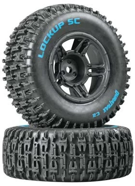 This is a pair of DuraTrax Short Course Lockup Tires Mounted on Black 5-Spoke Wheels. Fits the front of the Traxxas Slash. FEATURES: X-pin pattern ideal for loose surfaces (wet mud and grass) C2 soft compound developed for gripping power on loose surfaces Color-coded sidewall markings make it easy to identify each tread pattern at a glance Five-spoke wheels, black in color Resealable packaging INCLUDES: Two Short Course Lockup Tires with Wheels and Foam Inserts REQUIRES: Mounting to vehicle SPECS: Width: 1.74" (41mm) Outer Diameter: 4.25" (108mm) Mounting Bead: 2.2" (56mm) Outer x 3.0" (76mm) Inner Hex Size: 12mm jxs 06/25/11 ir/jxs