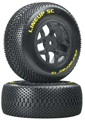 This is a pair of Duratrax Lineup Short Course C2 Tires and Wheels for the front and rear of the Losi SCTE 4x4. FEATURES: C2 (soft) compound is comparable to Pro-Line M3 and AKA soft ratings Square pin pattern ideal for hard packed (dry), blue groove (fast) and indoor clay (damp) track surfaces Color-coded sidewall markings make it easy to identify each tread pattern at a glance One-piece foam inserts INCLUDES: Two each, Lineup C2 Tires, Foam Inserts, and Black Wheels SPECS: Diameter: 4.2" (107mm) Width: 1.6" (42mm) Hex size: 0.47" (12mm) jxs 09/25/12 ir/jxs