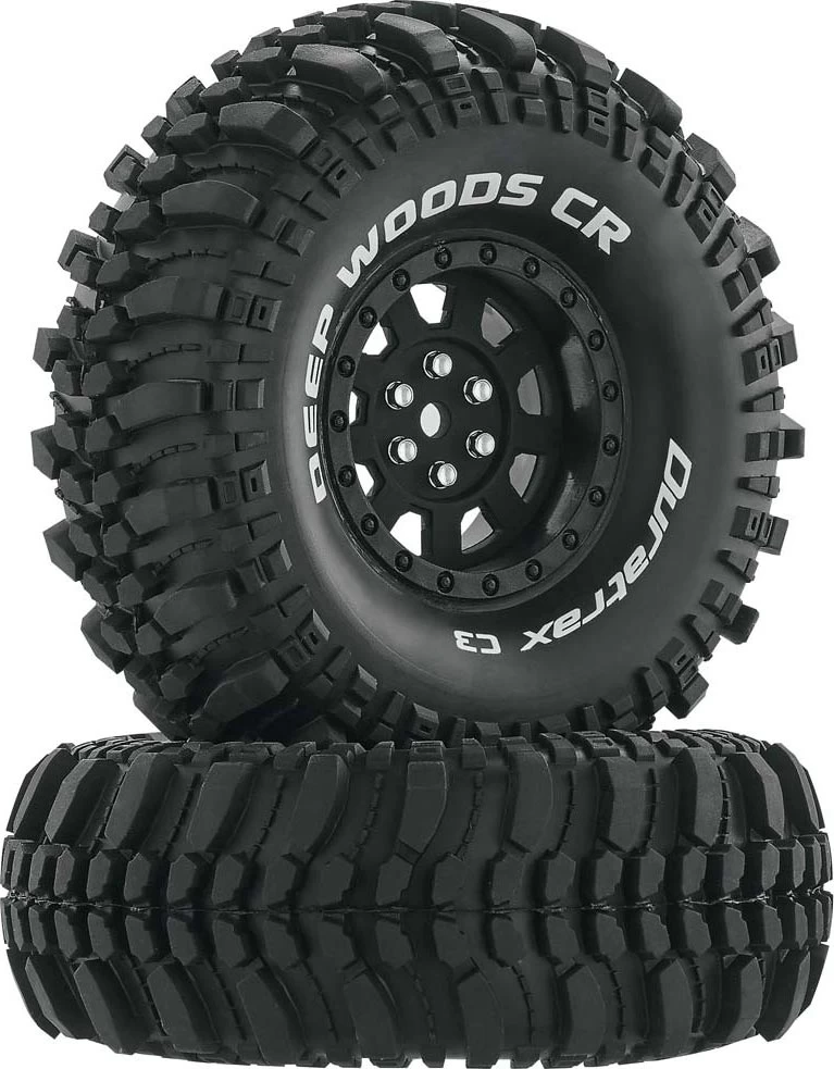 This is a pair of Duratrax Deep Woods 1.9" Scale/Crawler Tires in C3 Compound mounted to Wheels in Black. FEATURES: Aggressive tread for high degree of traction "Deep Woods CR" and "Duratrax C3" white lettering on sidewall Duratrax C3 compound compares to the Pro-Line M4 super soft, and the AKA Super Soft compound Wheels constructed of molded plastic with matte black finish INCLUDES: Two Deep Woods 1.9" Tires in C3 Compound with Foam Inserts Two 1.9" Crawler Wheels, DTXC3855 SPECS: Outer Diameter: 4.6" (117mm) Width: 1.6" (42mm) Inner Diameter: 1.9" (48.26mm) Hex Size: 12mm jxs 06/09/16 ir/jxs