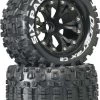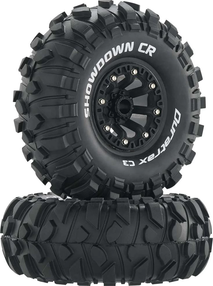 This is a pair of Duratrax Showdown 2.2" Scale/Crawler Tires in C3 Compound Mounted to Black Eight Spoke Wheels. FEATURES: Aggressive widely spaced tread for high degree of traction "Showdown CR" and "Duratrax C3" in white lettering on sidewall Duratrax C3 compound compares to the Pro-Line M4 super soft, and the AKA Super Soft compound Eight spoke molded plastic wheels, black in color INCLUDES: Two Showdown 2.2" Tires in C3 Compound with Foam Inserts Two Black Plastic Wheels, DTXC3857 SPECS: Outer Diameter: 5.3" (135mm) Width: 2.1" (53mm) Inner Diameter: 2.2" (56mm) Hex Size: 12mm jxs 05/27/16 ir/jxs