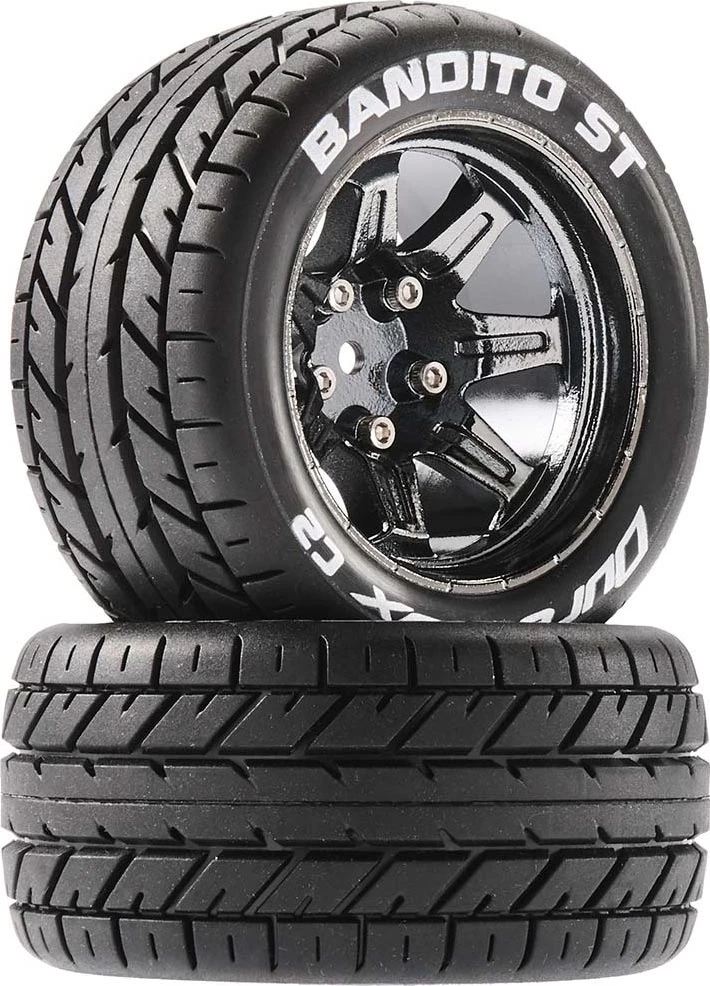 FEATURES: Ideal for the Arrma Granite 4x4 Mega Monster Truck, ARAD60** On-road radial style tread Mounted and ready to install INCLUDES: Two Duratrax 2.8" Bandito ST Tires with Foam Inserts 7-spoke hardened plastic wheels with black chrome finish SPECS: Wheel Diameter: 2.8" (71mm) Outer Diameter: 3.8" (98mm) Tire Width: 1.9" (49mm) Hex Size: 14mm COMMENTS: Also available with matte black wheels, DTXC5200 jxs 04/9/18 ir/jxs