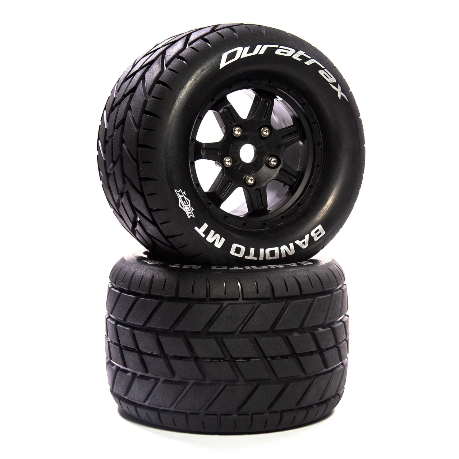 For running on pavement and hard packed clay surfaces Duratrax offers these factory mounted 1/8 scale BANDITO ST Belted front and rear tires for stadium trucks from ARRMA, HPI Racing and Traxxas. Molded from durable composite black plastic , the 17mm hex wheels measure 4.2 inches (105.5mm) wide and 6.5 inches (166mm) in diameter. The belted tires include one-piece foam inserts and are made from CS Sport Compound and are sold in pairs.
