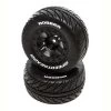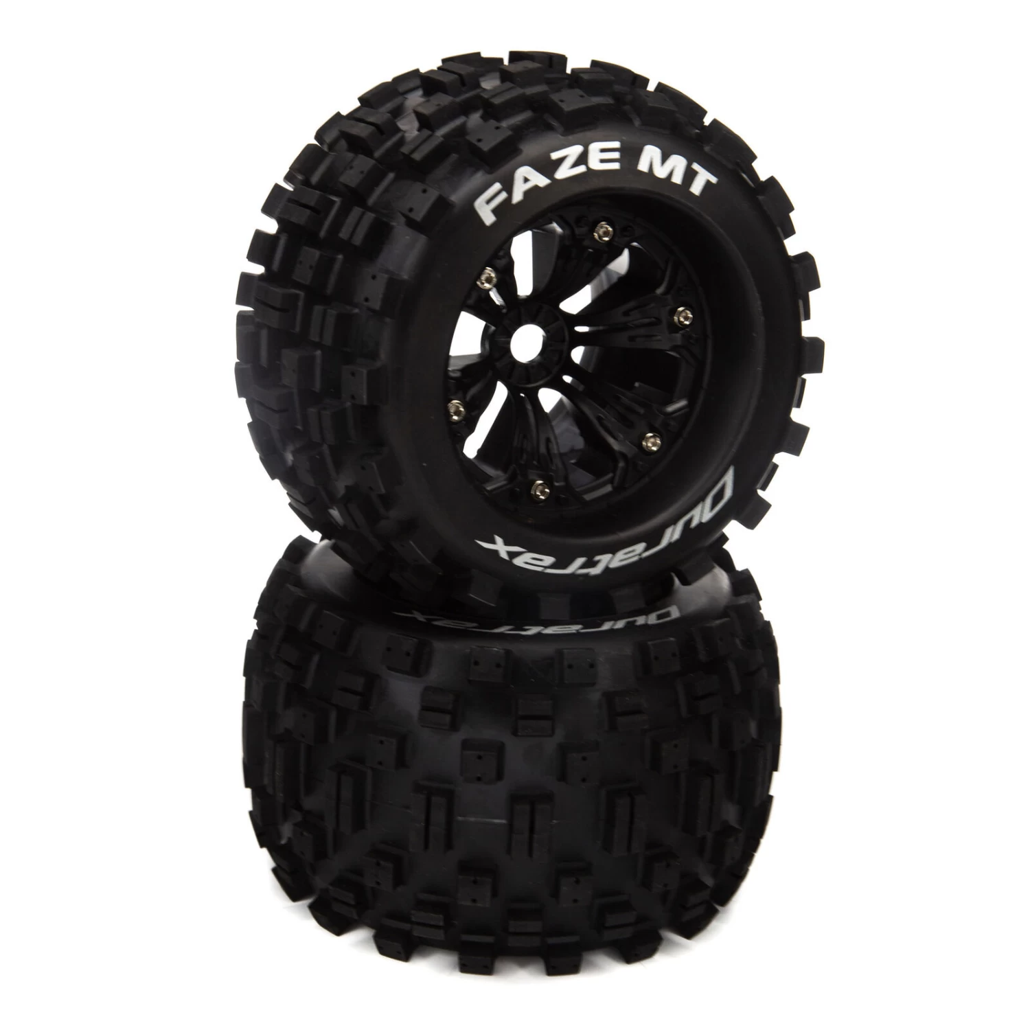Factory-mounted, these Duratrax® FAZE™ MT front/rear tires for 1/8 scale monster trucks feature an aggressive tread pattern that’s perfect for racing and bashing on pavement, hard packed dry and wet tracks, grass, mud and loose dry and loamy surfaces. The wheels are molded from a durable black composite plastic and have a 17mm hex and zero offset. Tires measure 4.2 in (107.8mm) wide with a 5.4 in (173.9mm) outer diameter. They include one-piece foam inserts and are made from high-performance, long wear CS sport compound. Sold in pairs.