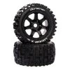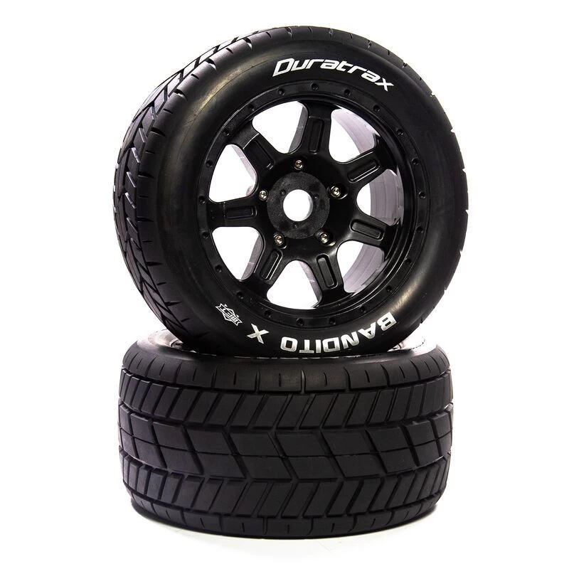 For the times you’re not thrashing your truck through loose dirt and mud Duratrax offers these factory mounted 1/5 scale BANDITO X MT front/rear tires for the ARRMA KRATON 8S monster truck and ARRMA OUTCAST 8S stunt truck. They feature a tread pattern that’s perfect for running on pavement, hard-packed clay, and similar conditions. Molded from a durable black composite plastic, the 24mm hex wheels measure 3.9 inches (98.2mm) wide and 8.0 inches (203.9mm) in diameter. The belted tires include one-piece foam inserts and are made from CS Sport compound. Sold in pairs.