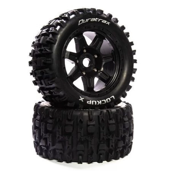 Duratrax offers these factory mounted 1/5 scale LOCKUP MT front/rear tires for the ARRMA KRATON 8S monster truck and ARRMA OUTCAST 8S stunt truck. They feature a tread pattern that’s perfect for running on a wide range of surfaces: pavement, hard-packed wet or dry, loose-dry loamy, loose-wet mud and grass. Molded from a durable black composite plastic, the 24mm hex wheels measure 3.9 inches (98.2mm) wide and 8.4 inches (212.8) in diameter. The tires include one-piece foam inserts and are made from medium firm CS Sport compound. Sold in pairs.
